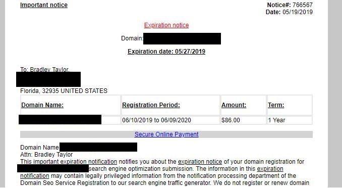 It will usually have the words “Expiration Notice” in bold or red letters. It will list an expiration date that is in the very near future. And it will have a link to “send a payment”. Notice it does not say “renew domain”.