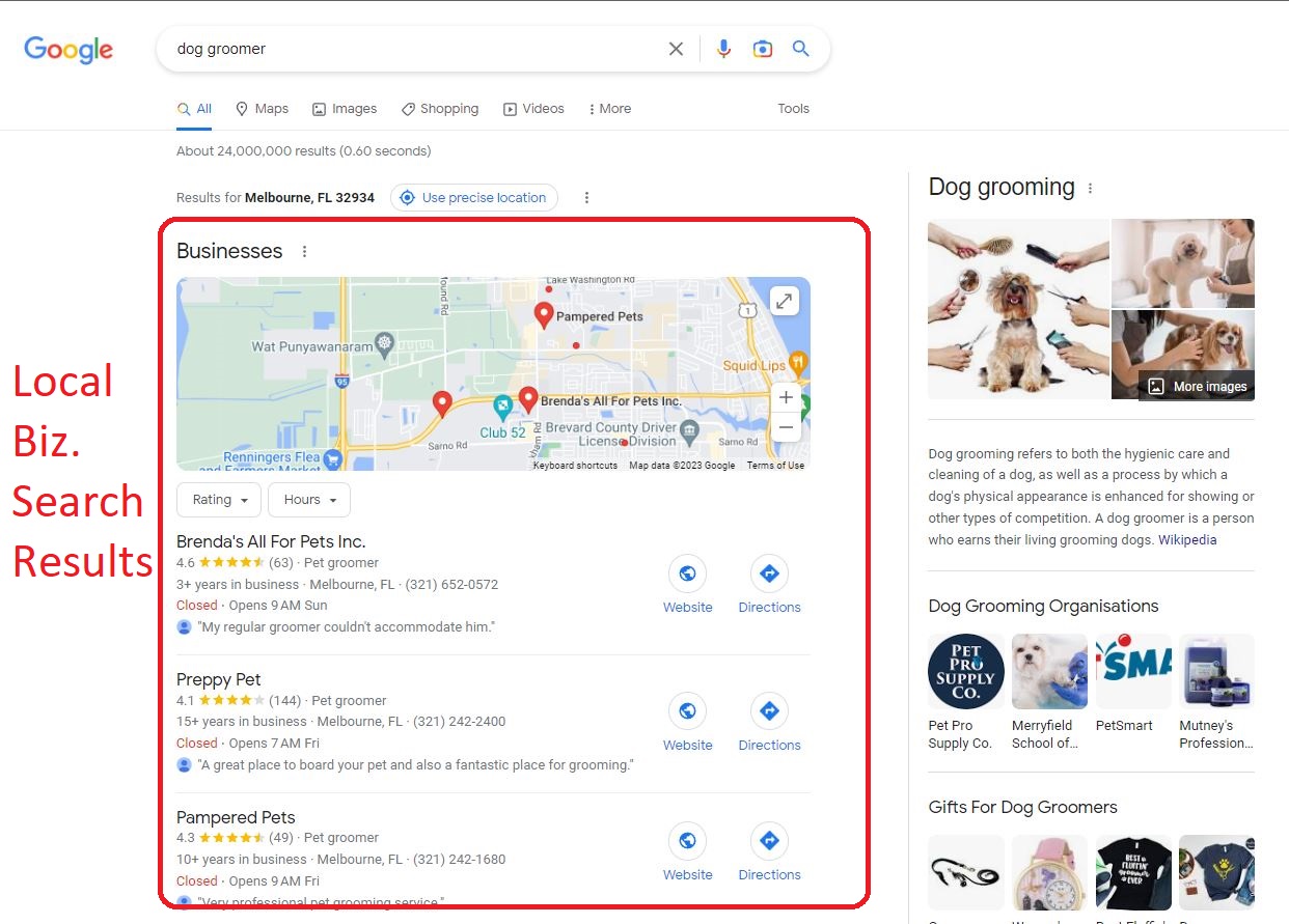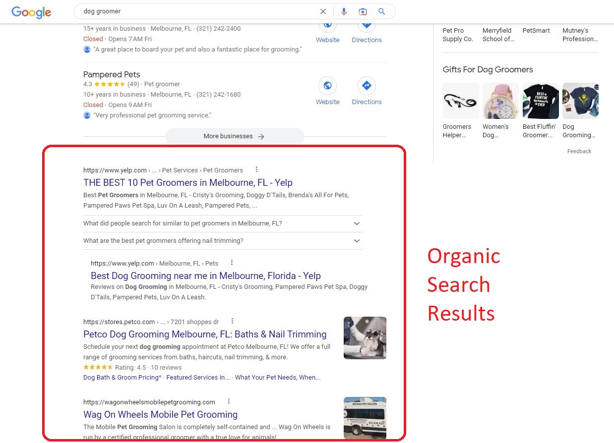In the organic search results, websites are ranked based on factors such as relevance, content quality, and backlinks. In the local business search results, businesses are ranked based on factors such as proximity, prominence, and categories.