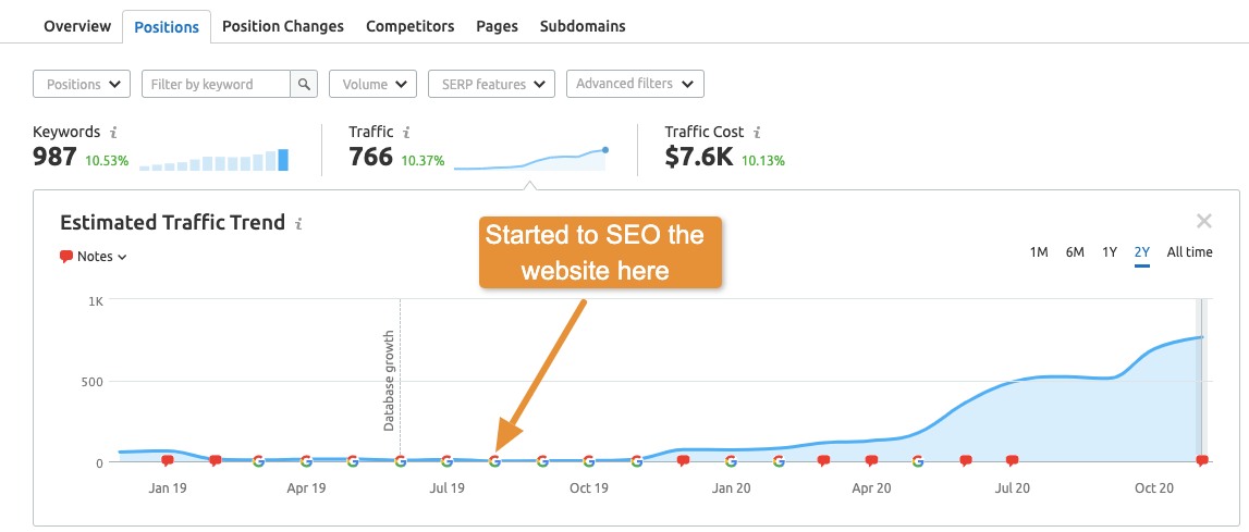 You can see in the image above that SEO work was started in August and had some effect starting three months later. It wasn’t until almost a year later that the traffic really started to take off.