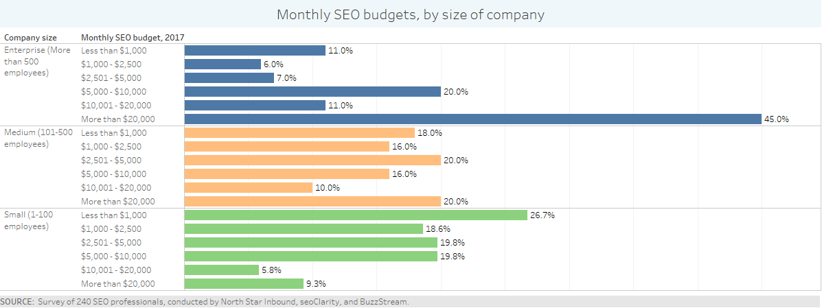 If you are a large national company looking to take over the USA for gadget xyz, well, you can be as aggressive as you like. But, don’t be shocked to learn that large companies with thousands of employees spend $35K-$50K per month on SEO. And this number does not include pay-per-click, nor does it include full-time SEO employees. These numbers are for outsourced work only.